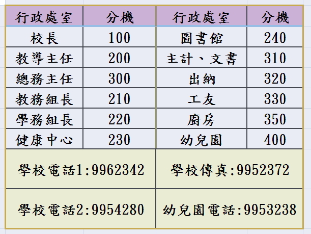 學務組長 | 李秉光 | 五忠 | 吳淑菁 | 廚工 | 吳淑芬 |